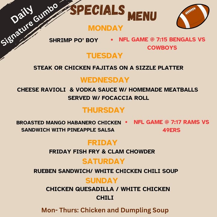 🌮🍺Daily Specials + 🏈Football @harpoonwillies 🍺🌮