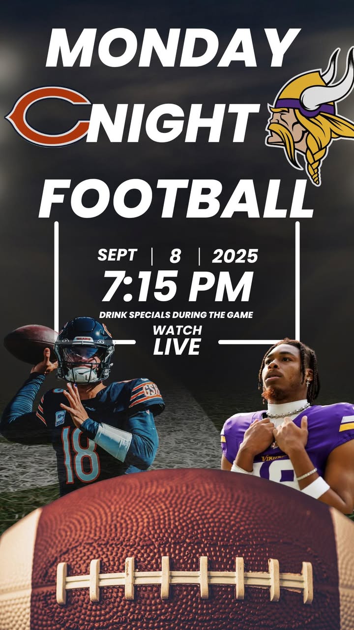 Bears Monday night football is here! Even Packers fans want to see the Vikings lose tonight. Come on down for great food and good company.