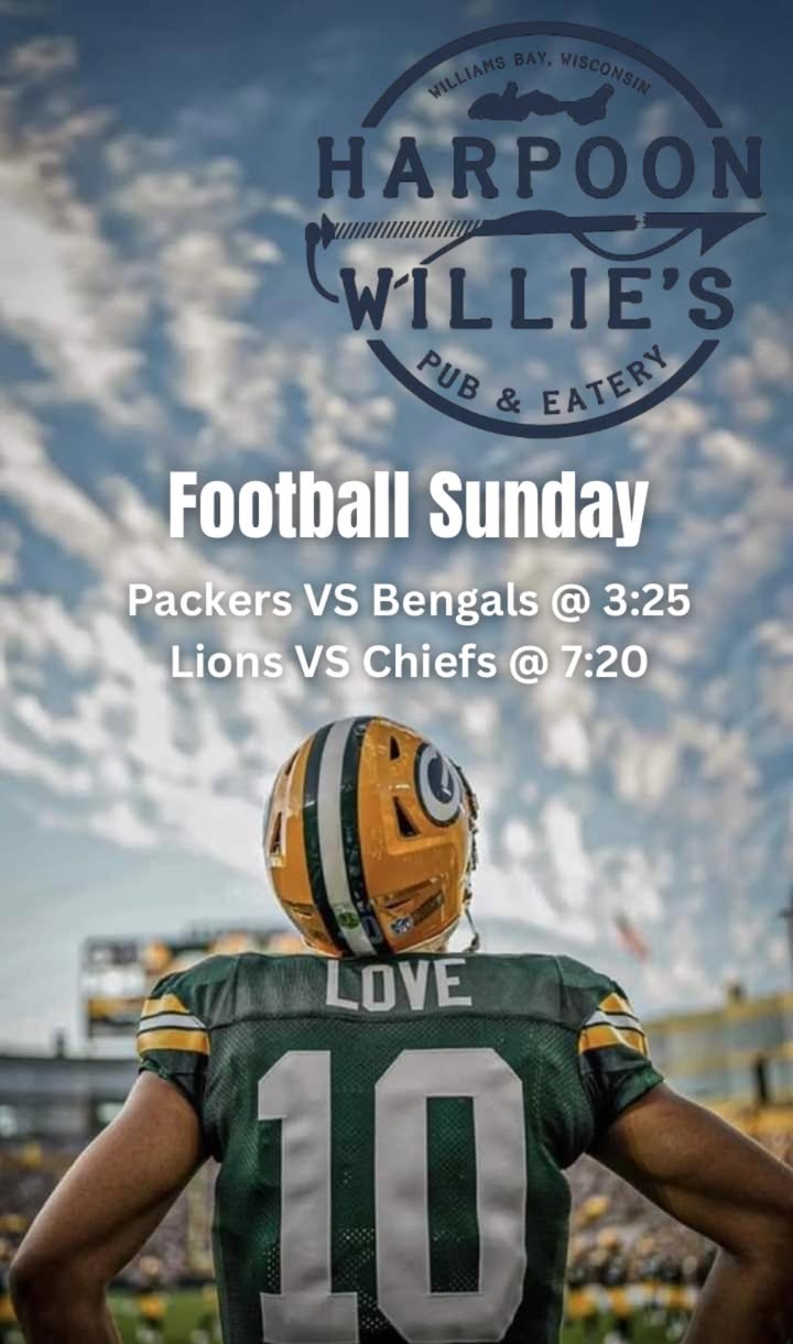 Sunday Funday at Harpoon Willie’s! Come watch the Packers take on the Bengals in your favorite sports bar. 🏈🍕🍻