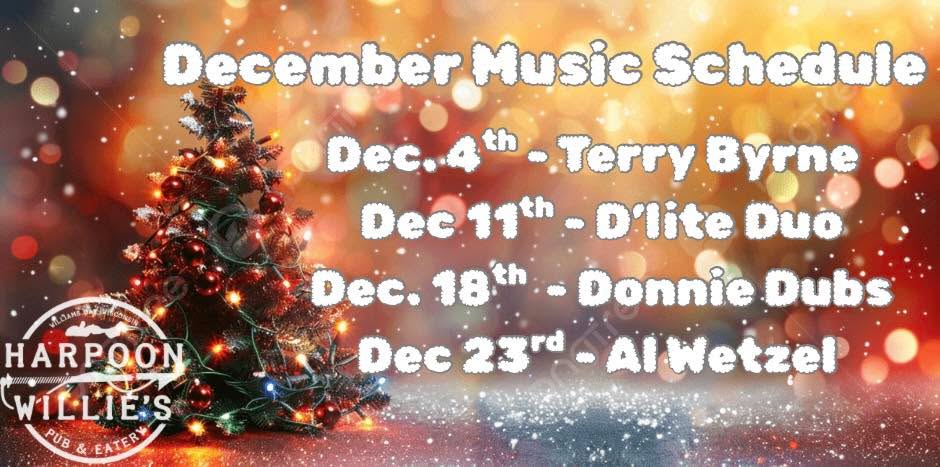 Happy December 1st! Your Monthly Music lineup is here. Every Thursday from 8-11 you can come to Harpoons and dance the night away.