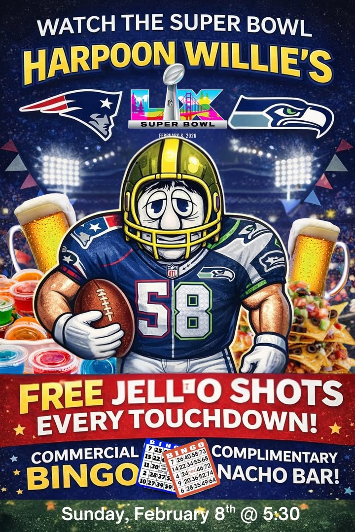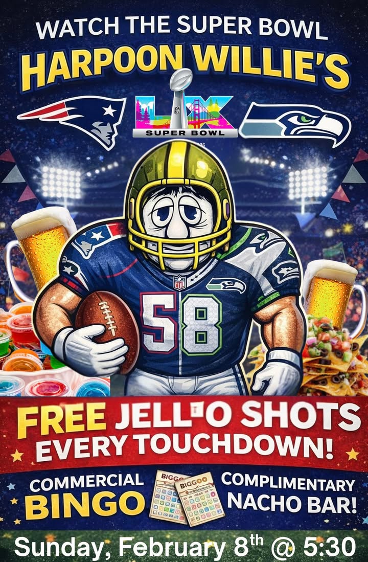 The Super Bowl is one week away! Still looking for the perfect spot to watch all the action? Harpoons is the party you won’t want to miss! Free Jell-O shots for every touchdown, complimentary nacho bar, commercial bingo, and lots of fun. 🏈🍻