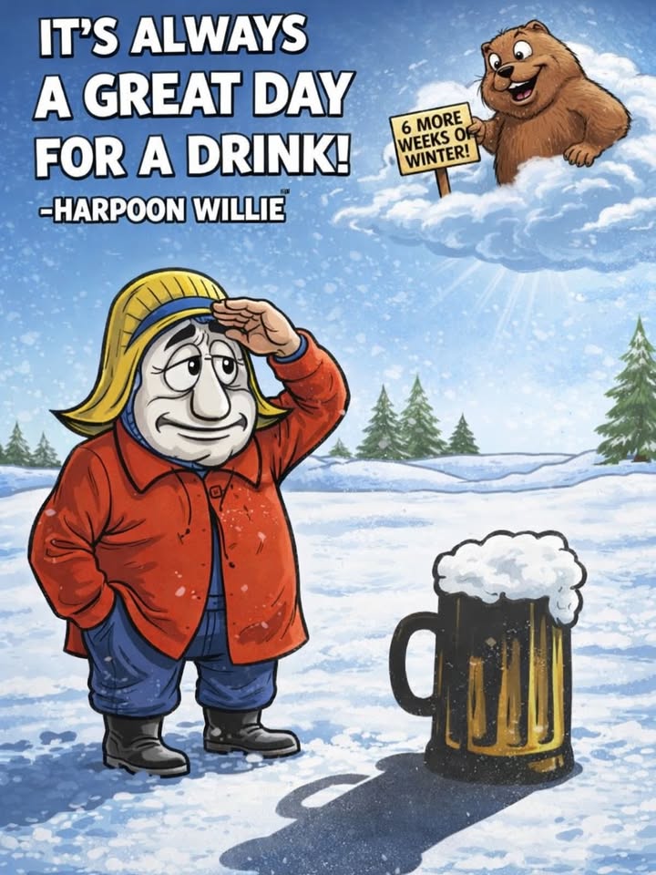 The words out- Phil says there’s 6 more weeks of Winter. Well, Willie says it’s always a great day for a drink!!