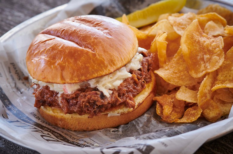 Applewood House Smoked Pulled Pork tossed with BBQ sauce topped with Cole Slaw on a Brioche Bun.