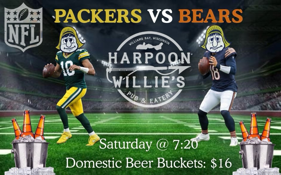 If you’re looking for a place to watch the Packers/Bears game this Saturday, Harpoons is the place for you! We will have the sound on and be offering $16 domestic buckets all game. #GoPackGo #BearDown