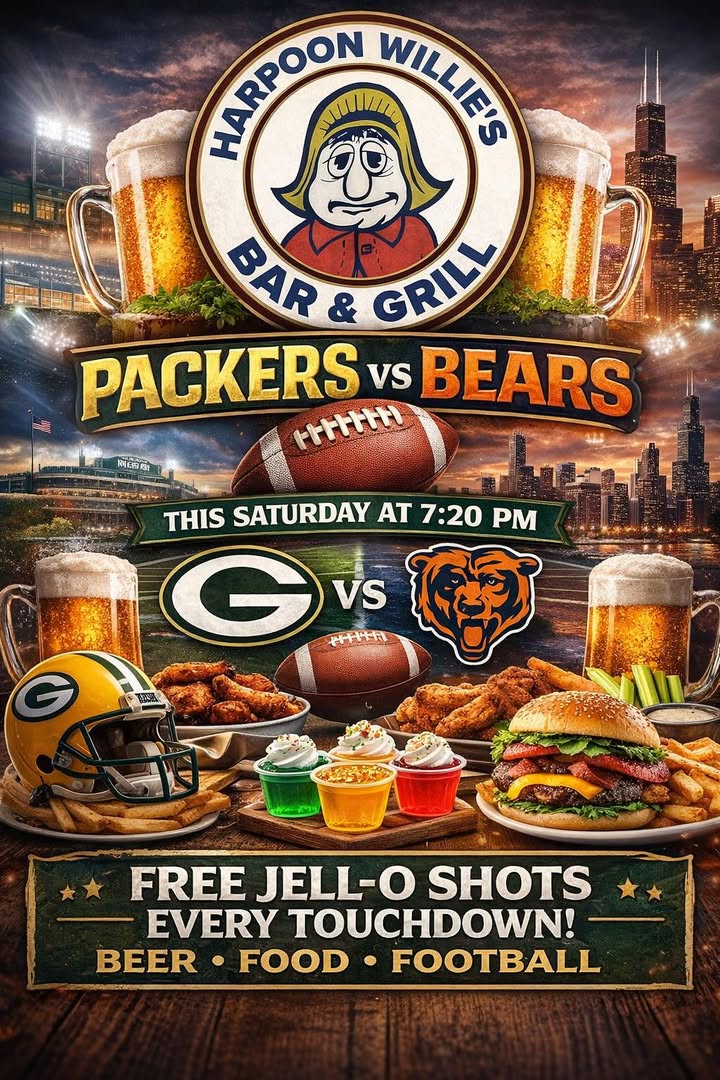 Looking for a place to watch the Packers VS Bears game tomorrow? Harpoons is the place to be! Game will be playing with the audio, and we are giving out free Jell-O shots for every touchdown! Come cheer on your team 🧀🐻